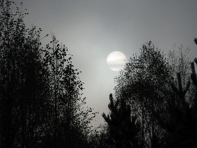 Früh morgens Sonne hinter Nebel - könnte auch abends mit Mond sein.