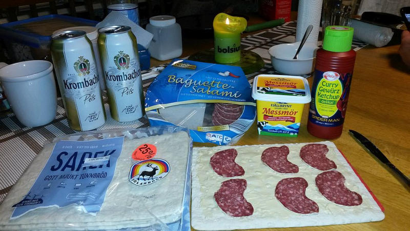 Dann: Fladenbrot vom Sarek-Nationalpark mit Fjällbrynt-Aufstrich, belegt mit Salami und