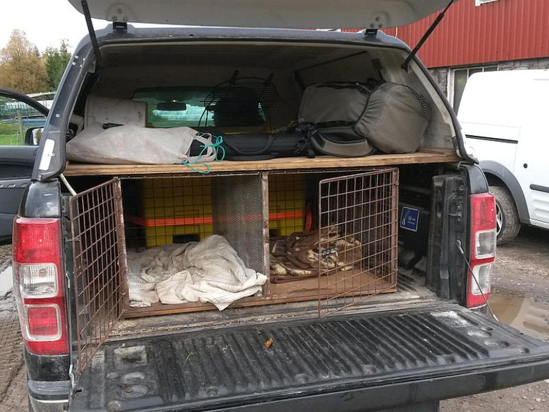 Der Jagdleiter und ich haben uns in jeweils einen Käfig gezwängt