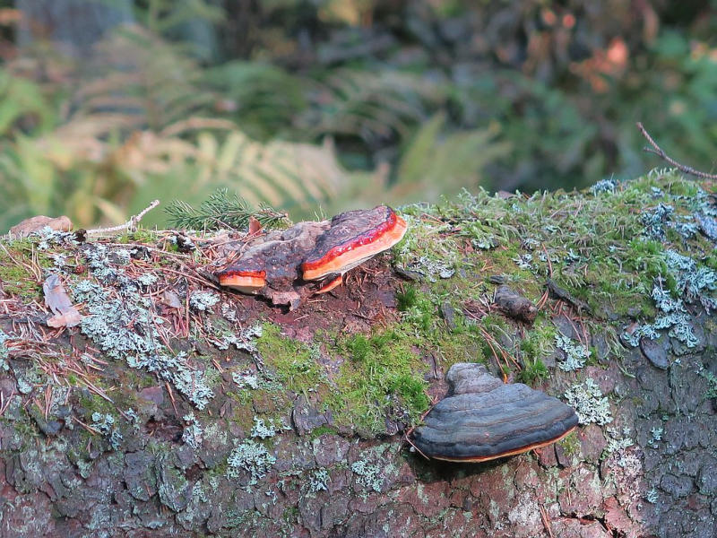 Pilzbiotop an liegenden Fichten.